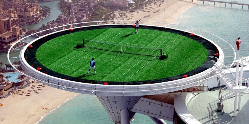 When tennis stars Roger Federer and Andre Agassi visited Dubai, the Burj Al Arab Hotel converted their helipad into a tennis court 1,053 ft. in the air.
